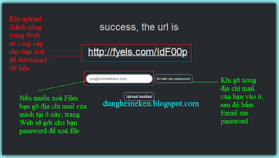 Muốn xoá file đã được upload, bạn nhập địa chỉ Email của mình rồi nhấn nút Email me a password, sau đó bạn đăng nhập vào hộp thư của mình để nhận password và link liên kết dùng để xoá files mà FYELS đã gởi.